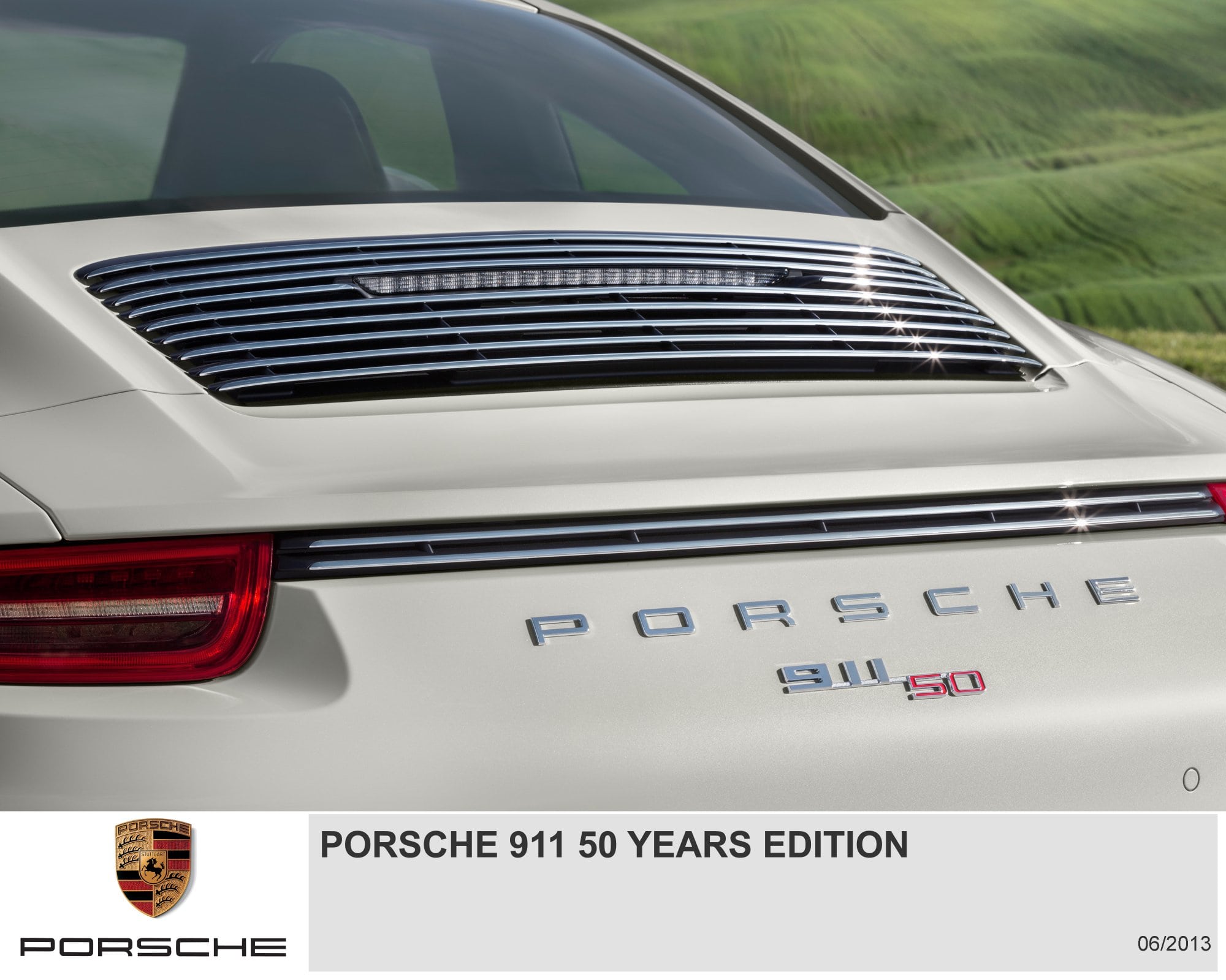 The Porsche 911 limited edition 50th anniversary models sold in the U.S. will be equipped with the Powerkit as standard, increasing engine performance to 430 hp on the Sport Chrono Package. This gives the 50th Anniversary a 0-60 mph time of just 4.2 seconds; or 3.8 seconds with the PDK installed. Top speed is 186 mph. The Anniversary Edition is a top-fit Porsche 911 Carrera S with special badging and interior details to denote its Limited Edition status. Each vehicle will be numbered.