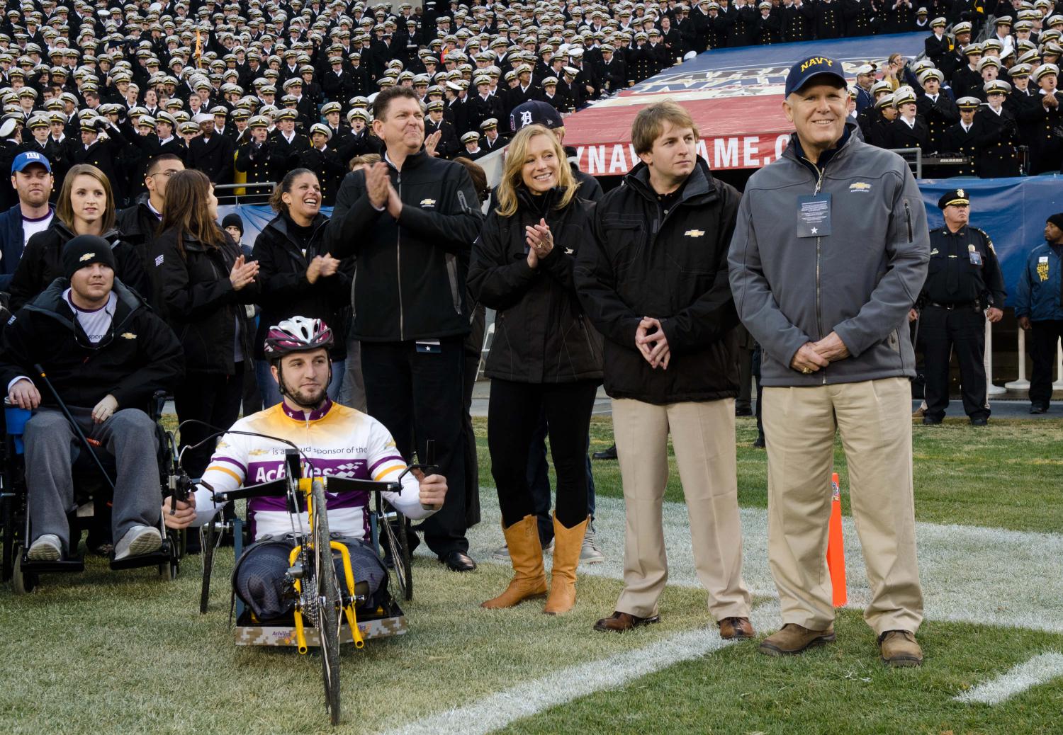 Operating the hand cycle – called the Tomahawk – will be retired National Guard Staff Sgt. Travis Wood of Cedar City, Utah. Wood, who lost his right leg above the knee in a 2007 bomb blast in Afghanistan, is among 20 members of the Achilles Freedom Team of Wounded Veterans competing in Detroit as guests of Metro Detroit Chevy Dealers.