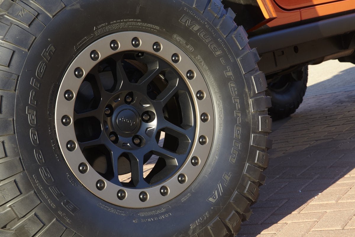 The Mopar Blue exterior is linked in appearance to the prototype eight-lug beadlock wheels by the Mopar Blue color on the beadlock ring. Wrangler Maximum Performance rides on 37-inch BFGoodrich Mud Terrain tires, with the sturdy hardtop covering full steel doors. The rear of the vehicle receives a prototype tire carrier and a 37-inch spare tire cover featuring the Jeep Performance Parts logo. Wrangler Maximum Performance also sports the five Moab “Badge of Honor” badges.