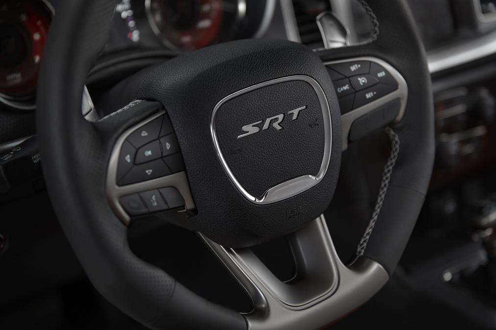 A redesigned SRT-branded heated steering wheel features a flat bottom and thick rim for the high-performance driver. Standard paddle shifters are located on the back of the upper spokes. The buttons to control the driver-configurable, full-color thin-film transistor (TFT) display are large and illuminated. Buttons for Uconnect and phone access now reside along the bottom edge of the horizontal spokes. Optional adaptive cruise control is configured by buttons that are symmetrically opposite on the right-hand side of the wheel. As before, the highly praised audio controls are still found on the back of the upper spokes. This new power tilt-telescoping steering wheel also has a 360-degree heat element.