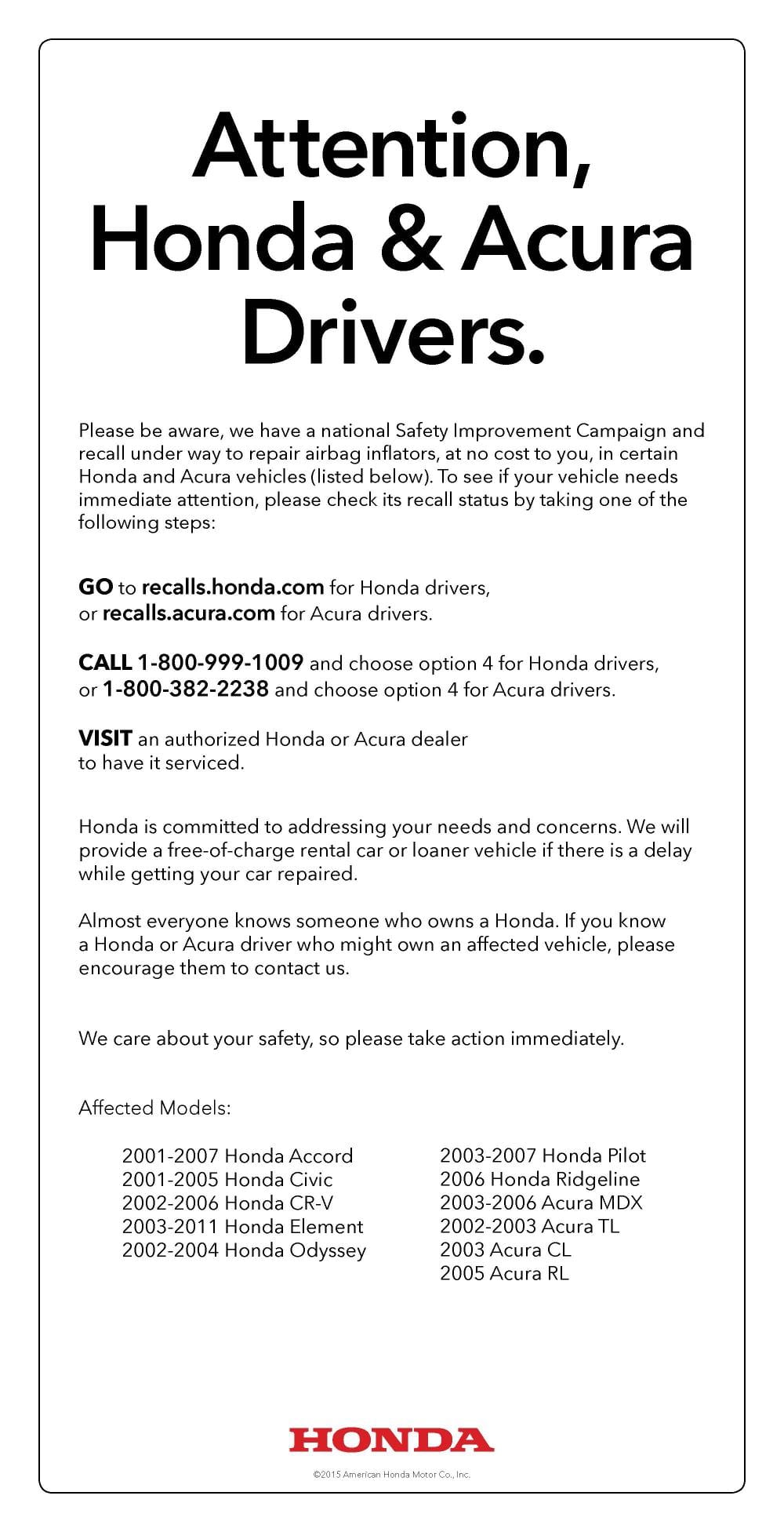Honda has begun a voluntary consumer information advertising campaign to urge Honda and Acura owners to immediately check for open recalls on their vehicles. The ad appears below.