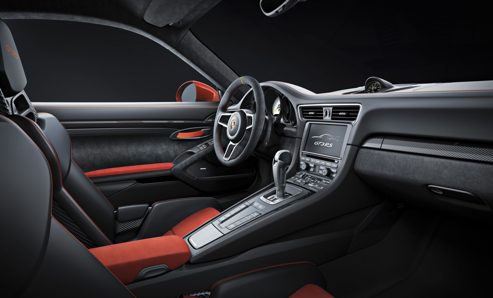 The interior design of the 911 GT3 RS with Alcantara elements is based on the current 911 GT3. Sports seats are based on the carbon fiber bucket seats of the 918 Spyder super sports car. Other standard features are the Club Sport Package with a bolted-in roll cage behind the front seats, preparation for a battery master switch, and a separately provided six-point safety harness for the driver and fire extinguisher with mounting bracket.