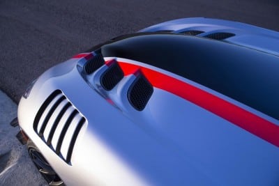 The rear carbon fiber diffuser extends forward of the rear axle. It includes six removable strake extensions, designed to rub against the track surface for increased straight-line stability and optimized downforce. Removable hood louvers over the front tires reduce air pressure in front wheel wells to provide additional downforce. The detachable front splitter extension and dive planes work with the rear aero treatment to provide outstanding grip and balanced performance on the track.