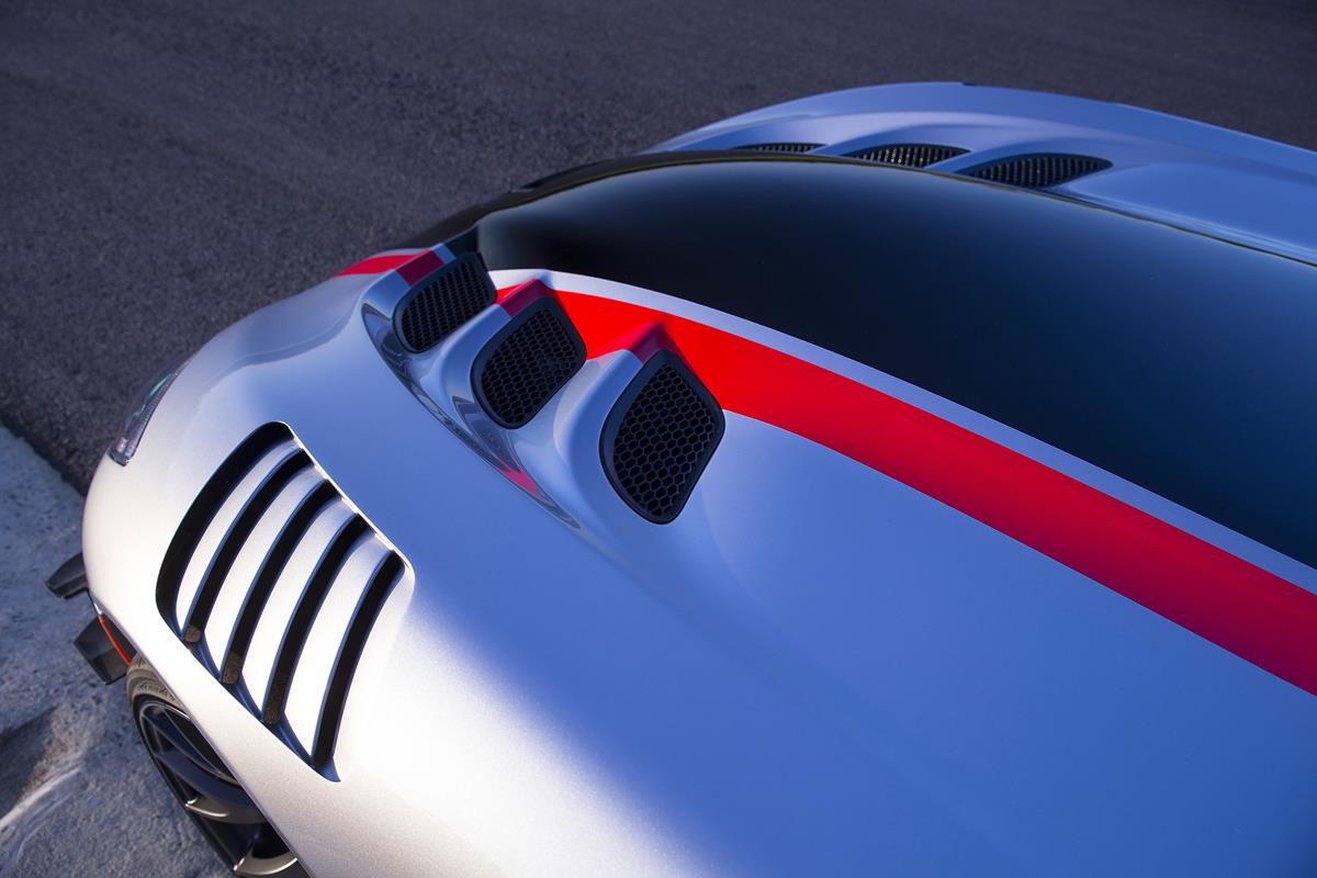 The instrument panel cluster hood, lower instrument panel and door armrest panels of the race-inspired interior are wrapped in unique Alcantara suede. A new, ACR-exclusive Alcantara wrapped high-grip steering wheel with color racing stripe and unique badging sets the ACR apart from other production models. New high-grip seats also carry the Alcantara inserts, while the unique dash plaque is finished in carbon fiber. Customers can choose between silver or Header Red accent stitching throughout the interior.