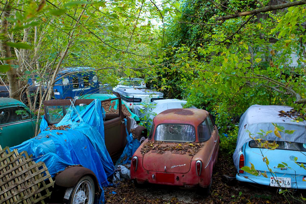 Tom Cotter, the author of the book, details the trio’s drive through their fourteen-day adventure. The plan is to hit three states over fourteen days and find as many old “barn find” style cars as they can. They count only cars made over 30 years ago, with some rare exceptions, and count them only if they are in “barn find” (i.e. “needs work”) condition. In all, over their two week trip, they find over 1,000 cars lying along the back roads, under trees, hidden in sheds and barns, and even in a run down warehouse. Photography by Michael Alan Ross showcases their discoveries.