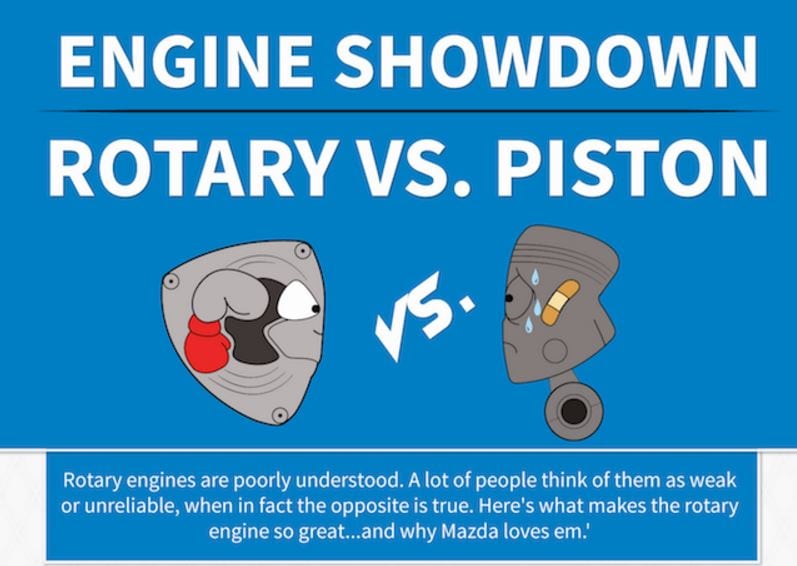 A new infographic from MazdaPartsUSA.com explains why the Wankel rotary engine continues to be part of Mazda’s future product plans. The graphic highlights the rotary engine’s superior power to weight ratio, smooth acceleration, and simplicity. The graphic also explains why Mazda “loves” the rotary engine.
