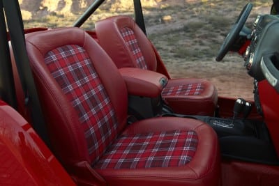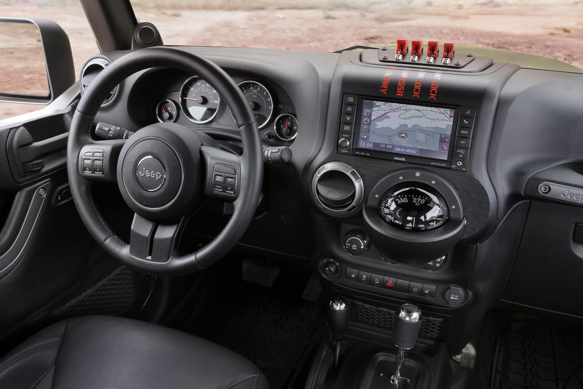 Inside, the no-nonsense interior features leather bucket seats with canvas inserts, aircraft-inspired control switches and Mopar all-weather mats. The media center features a centrally located navigational compass.