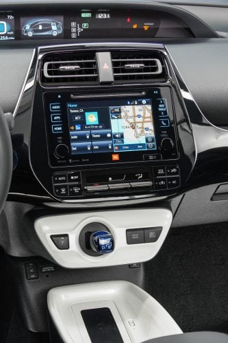 The blue joystick-like shift knob is still there, with a separate push button for park. This shifter is too small and clumsy and is an unfortunate remnant of the previous generation Prius.
