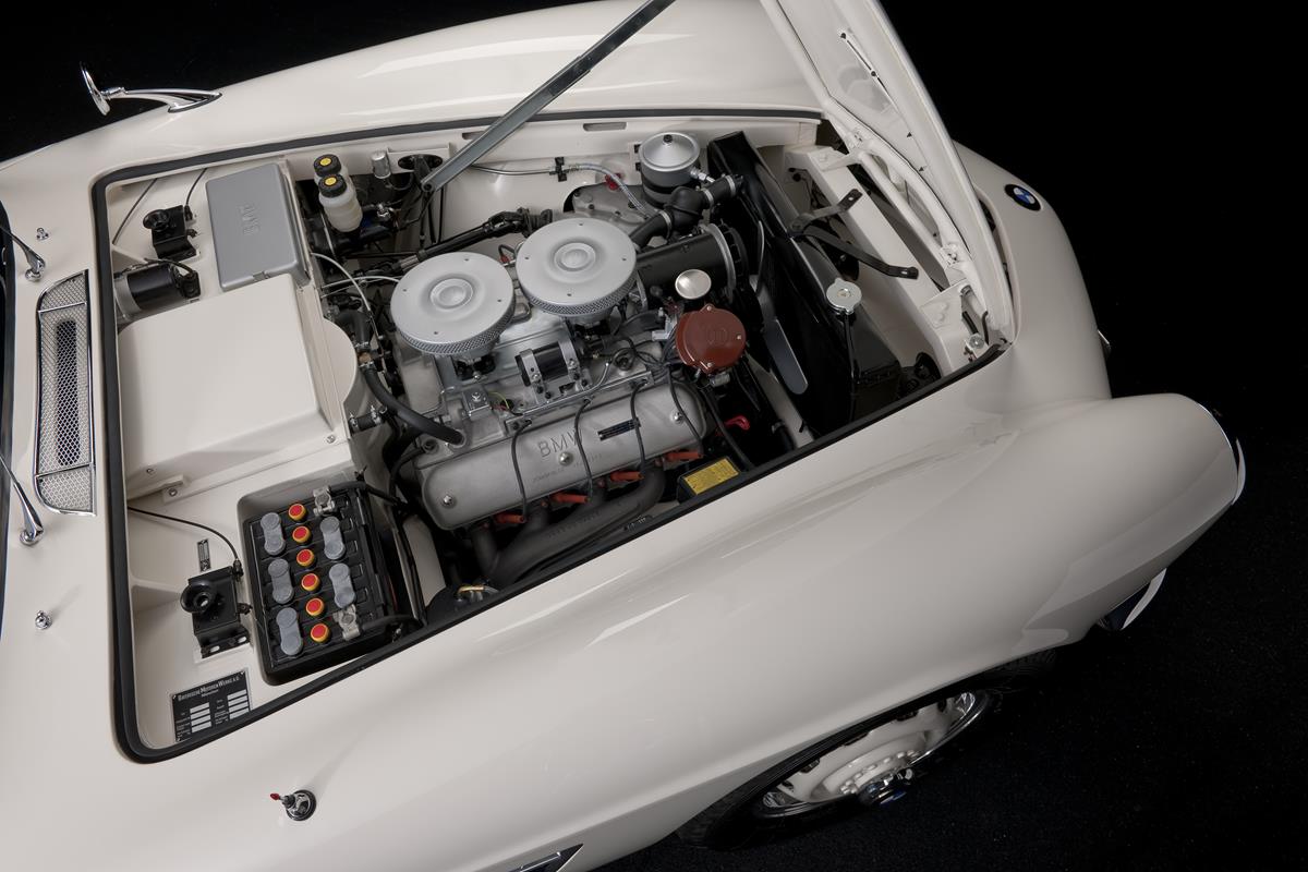 The engine for Elvis’ BMW 507 was completely rebuilt from spare parts. The 3.2 litre V8 engine was reconditioned precisely in conformity with the original specifications of the BMW 507, but it was not given an engine number on account of the unavoidable but otherwise unusual use of old and new components. The front frame carrier, which had been cut down at an early stage, also had to be reproduced in its original geometry and integrated in the floor assembly. The wooden nailing strip for fixing the soft top in place was also reproduced using materials and processing methods in keeping with the 1950s.