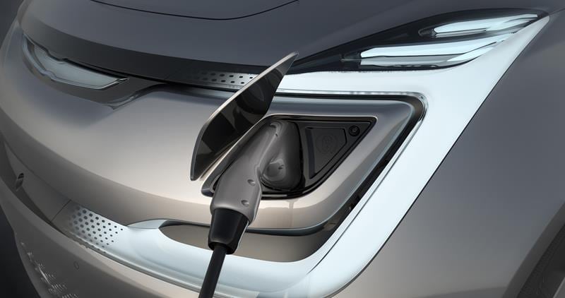 The integrated charging port, located at the front of the vehicle, uses the industry-accepted Combined Charging System (CCS) plug for energy and communication between the vehicle and charging equipment. DC Fast Charging at 350 kW enables the battery pack to be recharged for 150 miles of range in less than 20 minutes. The Chrysler winged badge on the front fascia serves as a charging indicator light.