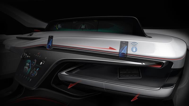 Up to eight docking stations, located in the instrument panel and seats, can be used for charging and securing mobile phones and tablet devices.