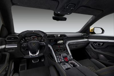 Internally the Urus is specified with a Unicolor leather and trim in either Nero Ade or Grigio Octans and five additional optional colors. Dual-color Bicolor Elegante and Bicolor Sportivo specifications with options of both leather and Alcantara are also available. Stitching options and complementary seat belt, floor mat and carpet colors allow clients to customize their Urus in a more sporty or elegant style as required. The dashboard trim is finished in Piano Black and Brushed Aluminum as standard. Optional finishes are offered in Open Pore wood including a combination with aluminum, and a carbon fiber alternative.