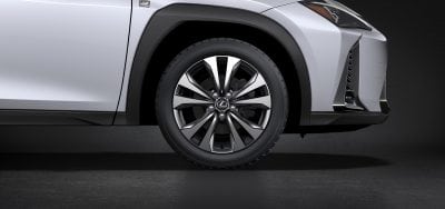Among new 17- and 18-inch aluminum wheel designs created expressly for the UX, the five-spoke 17-inch wheels feature a world-first aerodynamic design. Computer simulations and wind tunnel testing yielded a profile shape for the wheel’s spokes that increases the airflow to cool the disc brakes, without compromising the vehicle’s coefficient of drag (Cd).