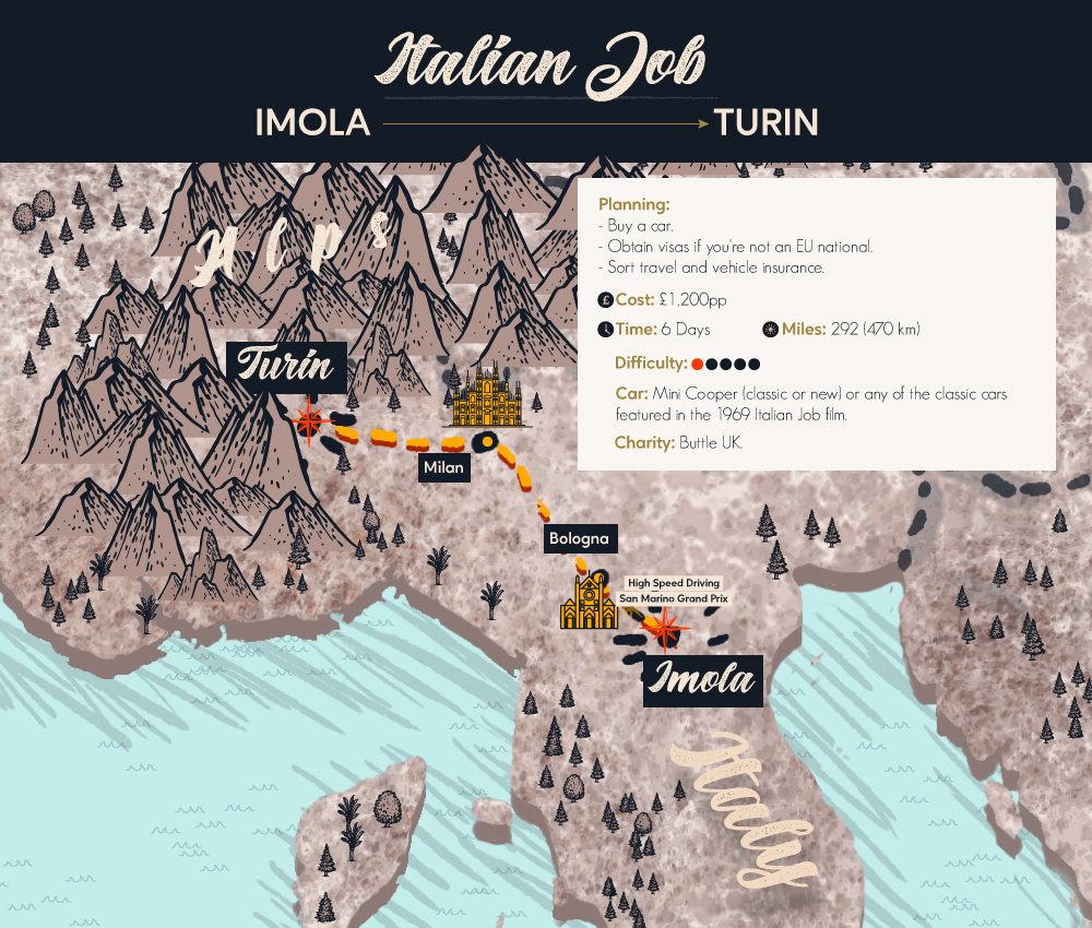 This famous event has now been running for 30 years and will see drivers start their engines in Imola before setting off along a 300-mile route to Turin, the hometown of The Italian Job.