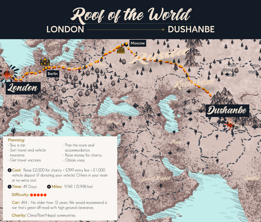 Take on a 16,000km sky-high journey to some of the highest roads in the world – aptly named the Roof of the World rally.