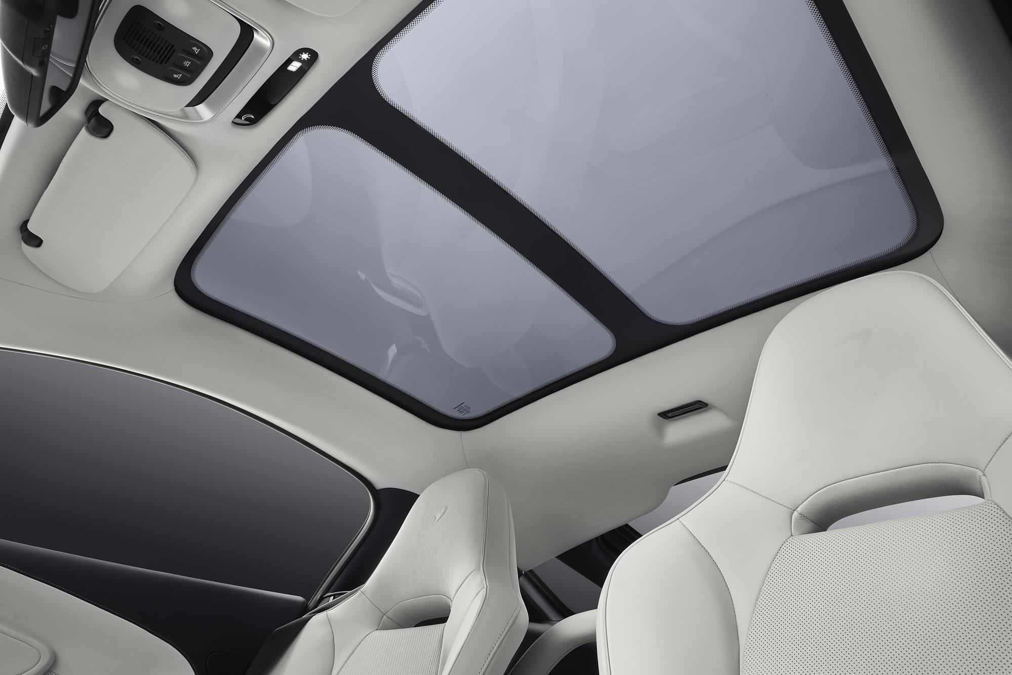 The strength of the carbon fibre core structure means that glazed C-pillars and rear-quarter windows can be incorporated into the design, enhancing rearward vision and bringing still more light into an inherently spacious and uncluttered cabin. Dihedral doors swing upwards to expose a wide opening and low sill.