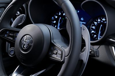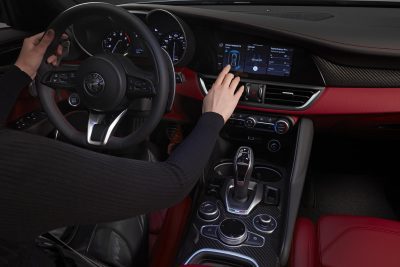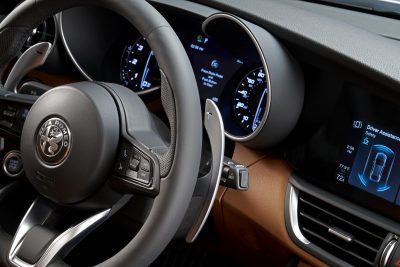 A new premium leather-wrapped shifter and a race-inspired steering wheel for all Giulia and Stelvio models feature Alfa Romeo’s characteristic steering wheel-mounted push-button start as well as refined materials. Standard laminated glass helps improve cabin ambience and the overall driving experience.