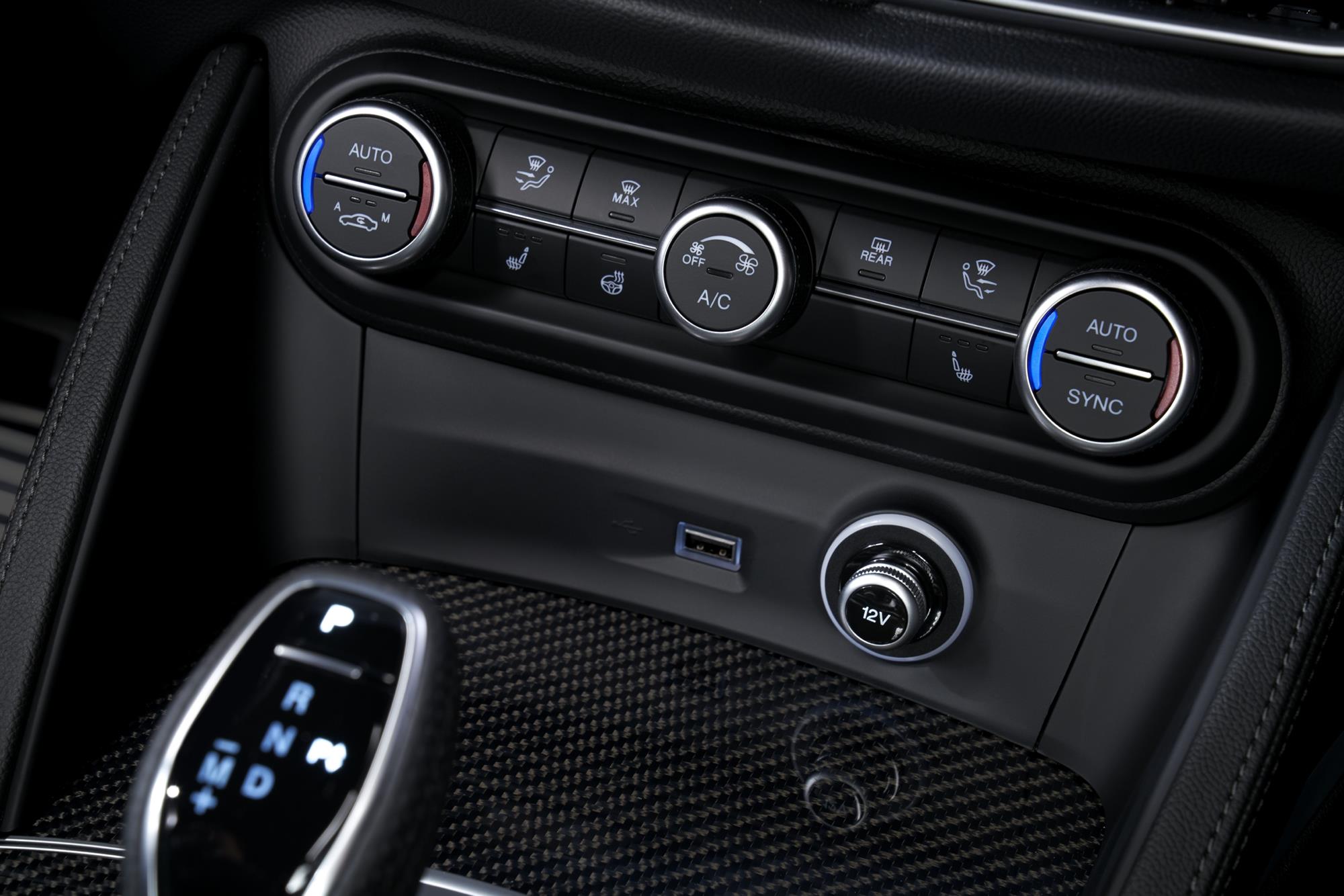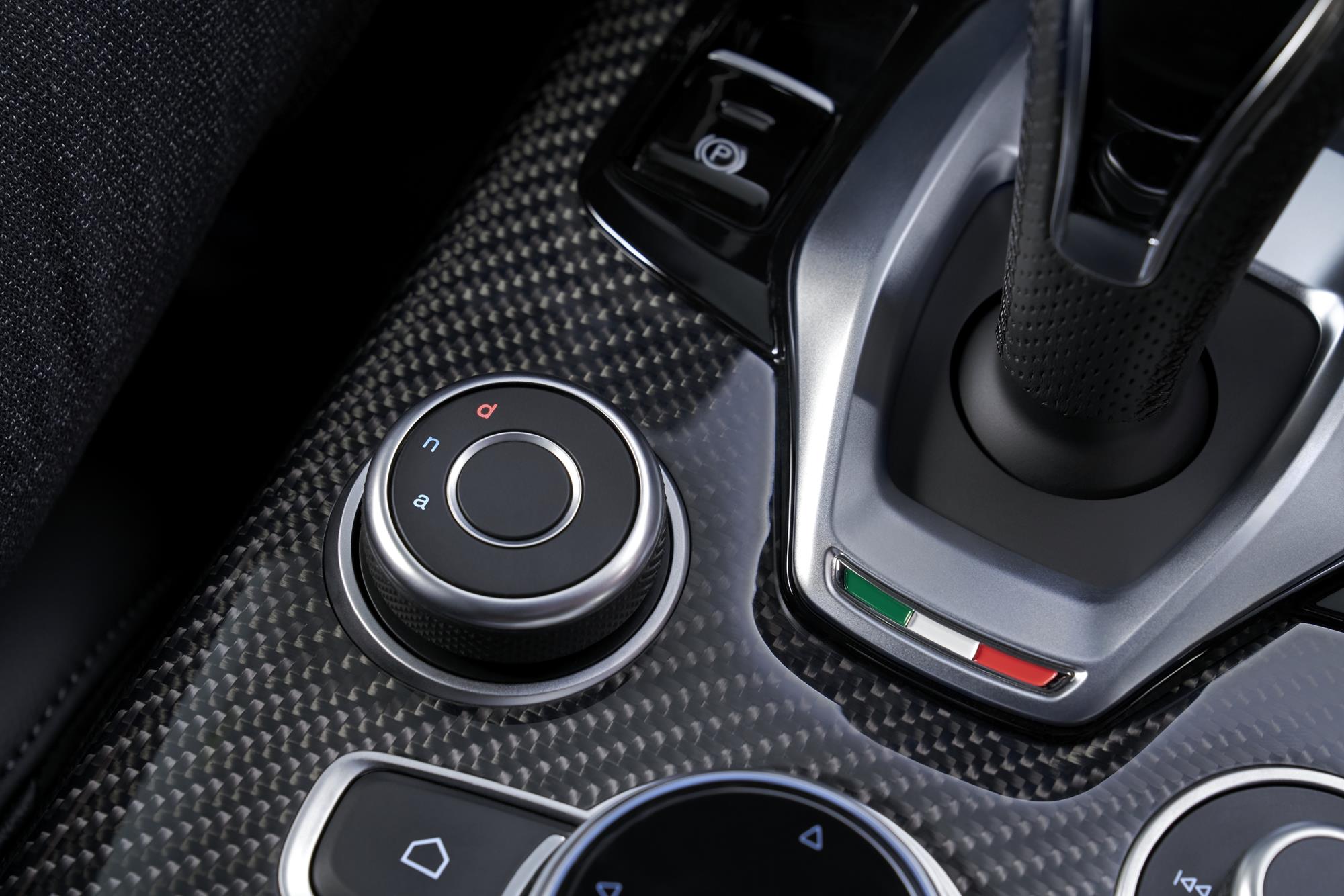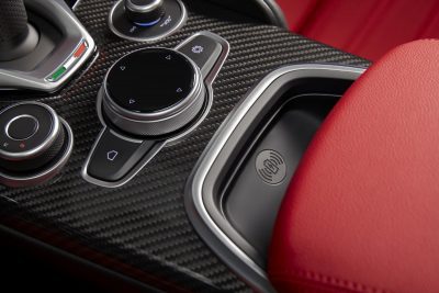 At the forefront of the refined interior is the new center console, which enhances the brand experience at nearly every touchpoint with an updated design featuring a machined-knurled aluminum-look rotary dial, upgraded knob materials and increased storage capacity. A new Italian flag badge at the base of the shifter signifies the country from which these vehicles were born, designed and crafted. Larger cup holders in the Giulia plus a new phone storage area with available wireless charging, round out the enhanced environment.