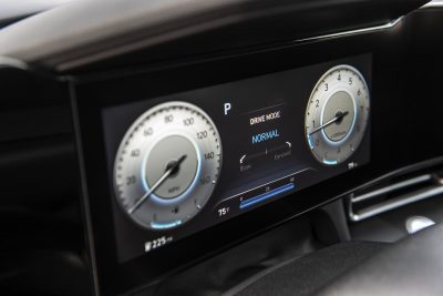 The 2021 Elantra has two futuristic 10.25-inch screens all under one piece of glass. The cluster has different views: utility, driver assistance and navigation. The optional infotainment system displays a wide variety of useful information across its 10.25-inch split touchscreen.