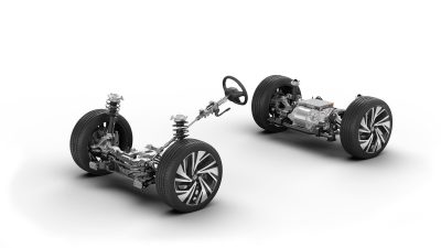 A combination of brake types is used on ID.4. It features disc brakes on the front wheels and drum brakes on the rear—the difference being specific to electric vehicle needs. As EVs rely on regenerative braking, disc brakes on the rear can be less effective than drums after long periods of not being put to heavy use.