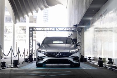 The demonstration features the EQS, showcasing automated valet parking using its existing hardware that is already preinstalled in vehicles such as the S-Class and EQS in Germany/Europe with the required optional equipment. The vehicle interacts with the Bosch intelligent infrastructure installed in the parking garage in order to enable the vehicle to drive and park itself inside the InterContinental Los Angeles Downtown.