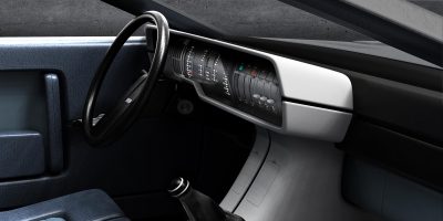 The minimalist interior showcases an iconic sensibility highlighting the monocoque design and driver-centered floating architecture. A single-spoke steering wheel and two-toned slim-line bucket seats reinforce what was in the 1970s futuristic aesthetic.