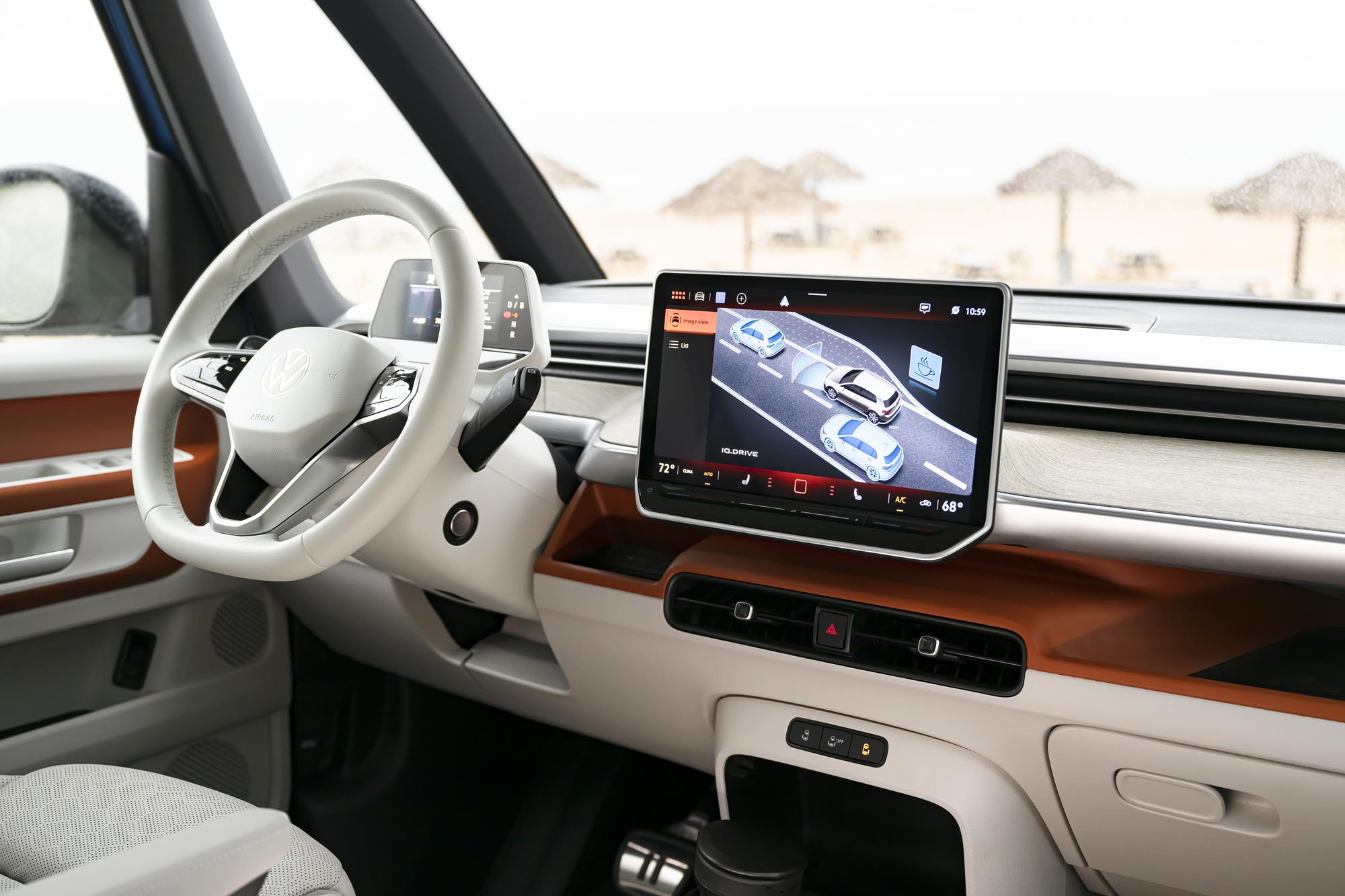 IQ.DRIVE® driver assistance technology, featuring hands-on Level 2 ready capability, is standard in the ID. Buzz. On the highway, IQ.DRIVE features lane centering and a capacitive steering wheel to help make driving easier. Around town, IQ.DRIVE helps alert you to obstacles in front of you, and keeps an eye around you to help make driving safer. Dynamic Road Sign Display is standard as well, and a head-up display, Park Assist with remote parking, and Area View are available features.