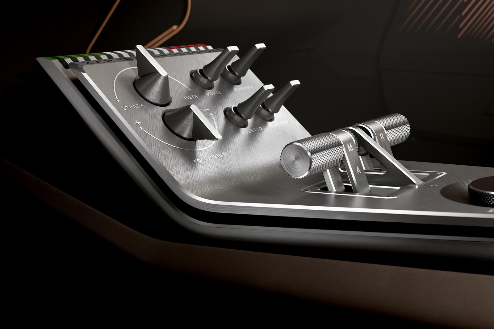 The steering wheel, devoid of all its usual buttons, offers an experience of pure driving pleasure. The cockpit-style instrument panel features controls located at different levels, including overhead, in the lining of the roof. The aviation-inspired dashboard and central tunnel employ materials such as aluminum, carbon fiber, leather and Alcantara. Wraparound seats reinterpret those of its forerunner, ensuring comfort and ergonomics. Every detail is designed to create an exclusive and engaging environment, maintaining the aesthetic and technical heritage of the 1967 33 Stradale.