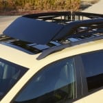 The tan exterior is accented to the Trailhawk black hood decal. A prototype matte black Mopar roof basket rides on top, with a bungee net holding down cargo. Below, aggressive BFGoodrich All-Terrain tires are mounted on prototype 17-inch wheels, embellished with aluminum granite crystal and black pockets.