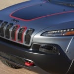 Inside, prototype Katzkin leather black seats with “Machined Gunmetal” inserts are heightened with Header Red stitching, which is also found on the steering wheel, armrest and shift boot. A Flame Red insert accents the entertainment center. Accessories showcased from the Mopar catalog include all-weather floor mats, bright door-sill guards with the Cherokee logo, a cargo tray for storage, and the JCMS with the Trailhawk bag, as well as the prototype Moab off-road bag.
