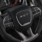 A redesigned SRT-branded heated steering wheel features a flat bottom and thick rim for the high-performance driver. Standard paddle shifters are located on the back of the upper spokes. The buttons to control the driver-configurable, full-color thin-film transistor (TFT) display are large and illuminated. Buttons for Uconnect and phone access now reside along the bottom edge of the horizontal spokes. Optional adaptive cruise control is configured by buttons that are symmetrically opposite on the right-hand side of the wheel. As before, the highly praised audio controls are still found on the back of the upper spokes. This new power tilt-telescoping steering wheel also has a 360-degree heat element.
