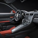 The interior design of the 911 GT3 RS with Alcantara elements is based on the current 911 GT3. Sports seats are based on the carbon fiber bucket seats of the 918 Spyder super sports car. Other standard features are the Club Sport Package with a bolted-in roll cage behind the front seats, preparation for a battery master switch, and a separately provided six-point safety harness for the driver and fire extinguisher with mounting bracket.