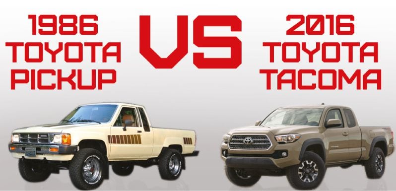 Comparing Toyota’s new 2016 Tacoma to a 1986 Toyota Pickup illustrates just how little Toyota’s small trucks have changed over the last 30 years. While the new Tacoma is vastly superior to the 1986 model in terms of fuel economy and overall safety, it’s shockingly similar to the old truck in terms of capabilities.