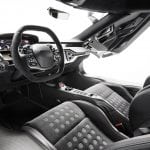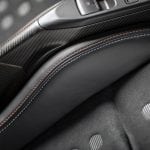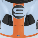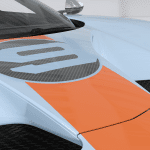 Ebony Alcantara wraps the seats, instrument panel, pillars, headliner and steering wheel. Contrasting blue and orange stitching accentuates the seats and steering wheel, with a new seat embossment inspired by the original 1968 Le Mans-winning car as well as clear and polished anodized paddle shifters.