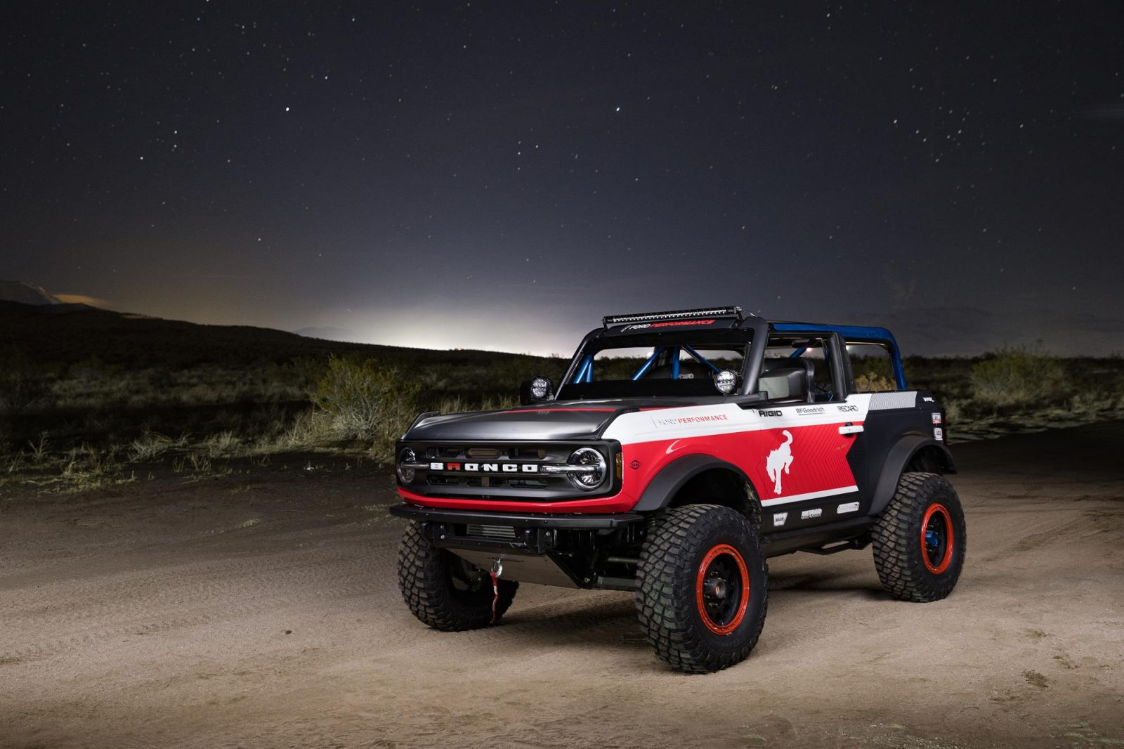 Bronco 4600 race trucks feature a new livery leveraging factory 2021 Bronco colors – Race Red, Oxford White and Velocity Blue. The front design takes inspiration from the 1969 Baja 1000-winning Bronco, with matte black hood, plus white upper and red lower body lines that transitions into a more modern Bronco design scheme extending rearward.