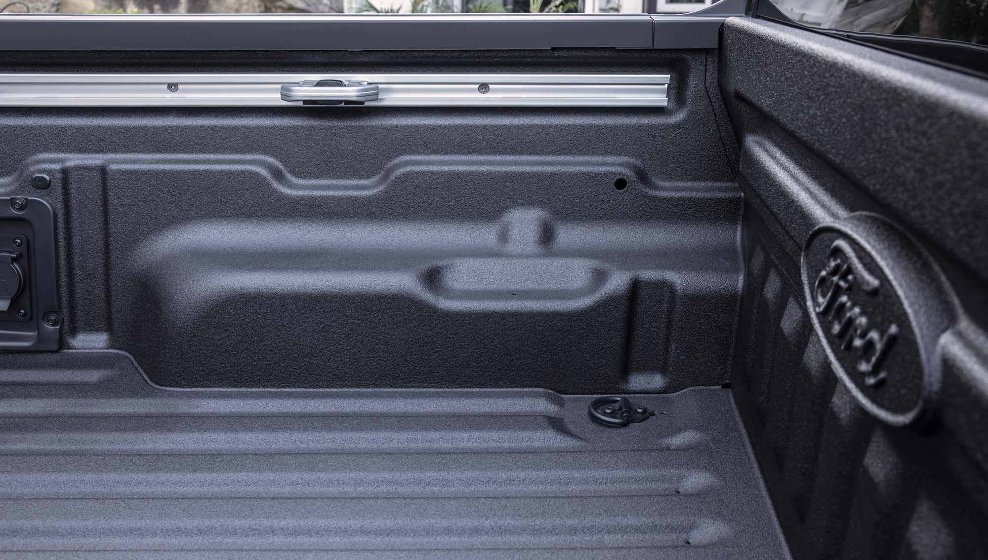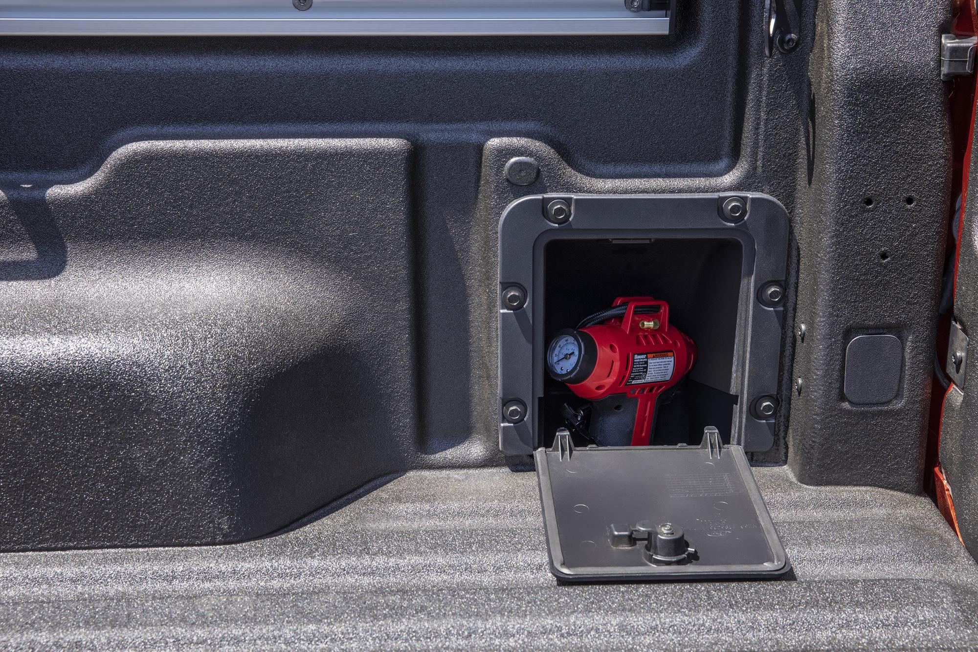 Beyond DIY electrical, there are two available 110-volt 400-watt outlets – one in the bed and one in the cabin – that can power phones, laptops, small TVs, a cordless tool battery charger, or a small, corded tool like a jigsaw. There’s also a storage cubby built into the side of the bed on XLT and two available on Lariat trucks, perfect for keeping a ball hitch or air pump.