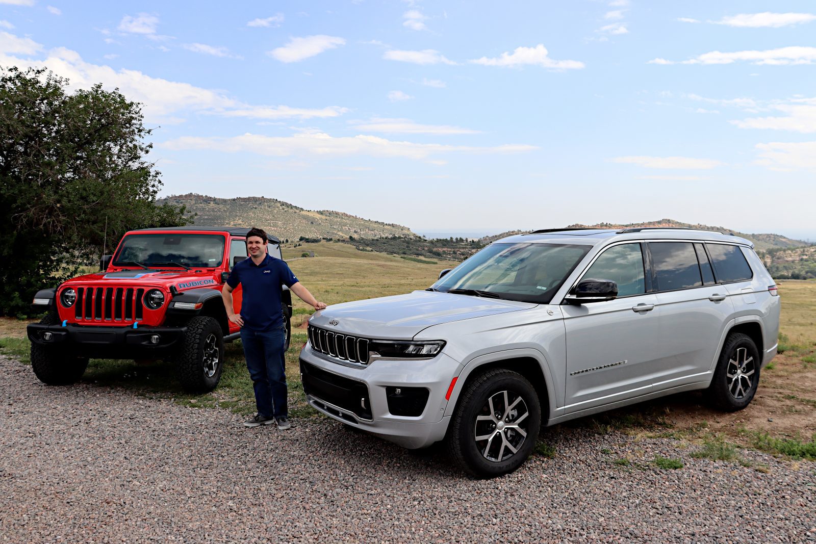 The Wrangler 4xe (pron. “four by E”, shown below left) is a plug-in hybrid Wrangler available in several configurations. In this case, it’s the Rubicon extreme off-road model. The “Wrangler with a plug” is smooth driving and feels great in the dirt. I didn’t get to seriously off-road it, but that will be coming soon as I’ve been promised more time with this rig and am looking forward to it.