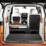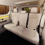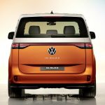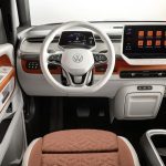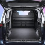 The standard length ID. Buzz will launch with five seats. Driver and front-seat passenger sit on individual seats with adjustable armrests (standard on the inside, optional on the outside). Integrated into the backrests of each front seat is a side thorax airbag, and in the driver’s seat there is also a center airbag, which in the event of a crash protects the driver and front-seat passenger from hitting each other. In top trims, the seats are completely electrically adjustable and have both memory and massage functions. Front seats can be adjusted up to 245 mm (9.6 in) forward and aft, and 61.5 mm (2.4 in) in height. A three-person bench seat in the rear can be folded down completely or split 40:60, and it can be moved lengthways a total of 150 mm (5.9 in). A love for detail is reflected in the stylized vehicle silhouette that is embossed in the lower side seat trim, and the fold-down tables located in the backs of the front seats. Wholly practical, by contrast, is the optional height-adjustable trunk floor, which creates a level load space surface. The upward-opening rear hatch reveals 1,121 liters (39.6 cu ft) of luggage space. Two side sliding doors are fitted as standard.