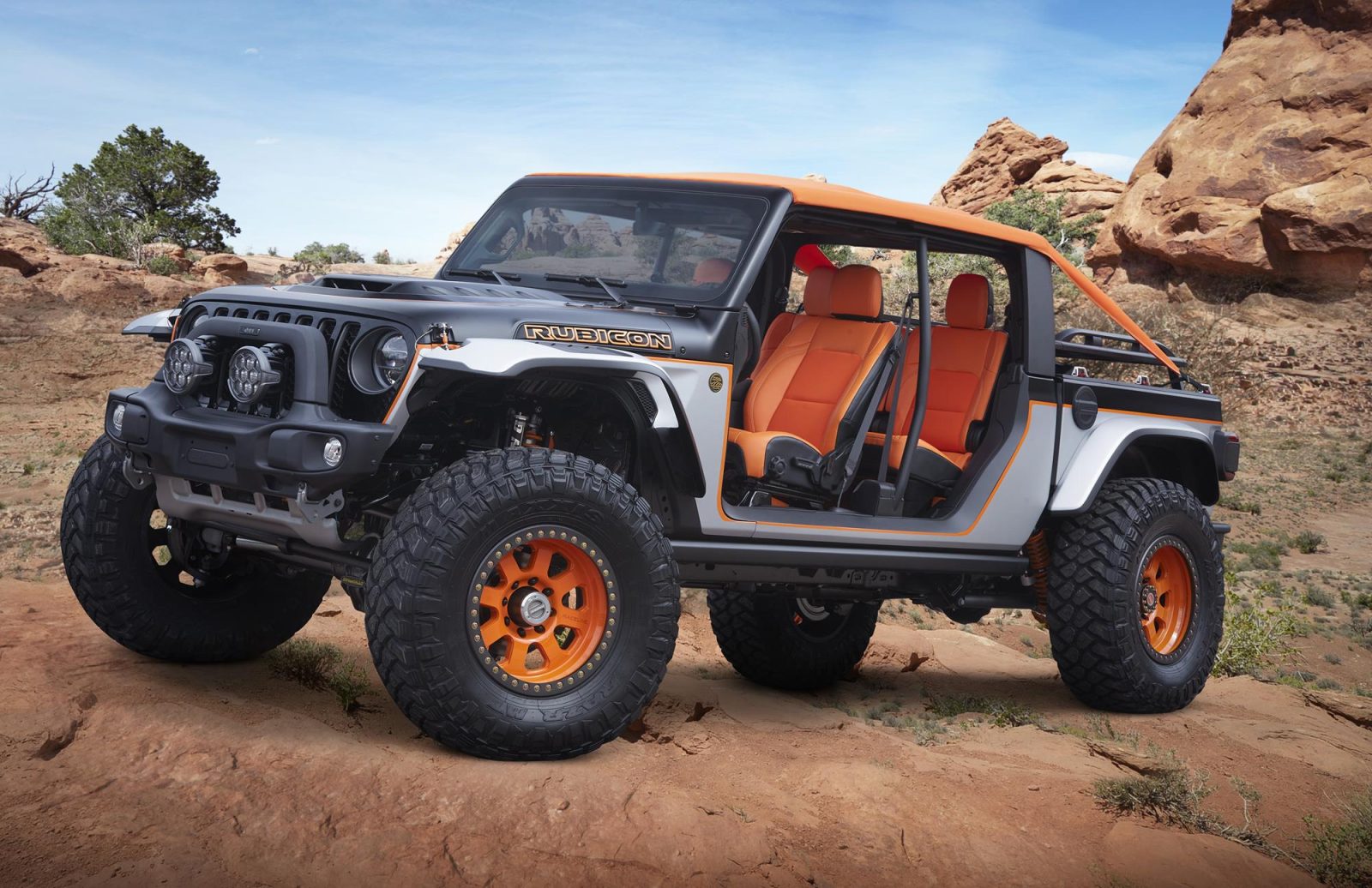 The modified four-door Wrangler Rubicon 392 features an active dual-mode performance exhaust that switches between wild and outrageous, a performance hood with center scoop, custom-built half doors and Sky One-touch powertop with removable side panels for open-air freedom.