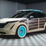 The Nissan Ariya Surfwagon concept also combines retro design with modern technology, reimagining the all-new 2023 Ariya all-electric crossover as a beach-style surf wagon, complete with a wood panel-style wrap and other accessories. Read more details on the Surfwagon concept.