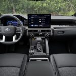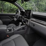 Tacoma makes the most of its cabin for this newest generation. Gas models have three times more storage space under the rear seat compared to the current-gen truck, and the rear seatback can also fold down flat for additional loading surface. A shelf is integrated into the instrument panel for the passenger to put a phone or other small items, and MOLLE panels on the center console and door panels allow for even more versatile storage. Rubber grips are located on the passenger side of the center console, on all doors, and on the front passenger side. Double Cab models also include assist handles on the B-pillar overhead. A hidden side pocket on the driver’s side dashboard has a QR code that directs owners to the Toyota website for dimensions to design and 3D print their own accessories such as a lantern, multitool, or toolkit.
