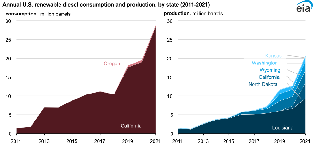 Most of the fuel being consumed was produced in Louisiana, but other states such as Kansas, North Dakota, Washington, and Wyoming are also large producers of renewable diesel. California itself produces at about the same level as Wyoming at roughly 8 percent of total production nationally.