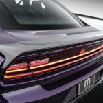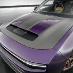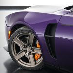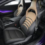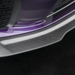- Exterior includes vivid Stryker Purple paint, satin carbon-fiber hood/splitter/deck-lid, vented fenders, and bold 21×11-inch Brass Monkey wheels with orange Brembo brakes.