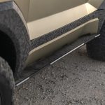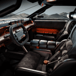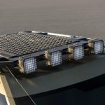 The exterior emphasizes strong off-road capability with features such as steep approach/departure angles, large off-road tires, prominent skid plates, and protective rocker panels. Unique design elements include hexagonal faceted wheels inspired by asteroid impacts, “limb risers” (cables front-hood to roof) for protection from overhanging obstacles, and parametric pixel lighting.