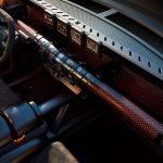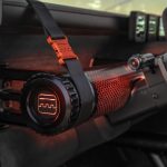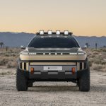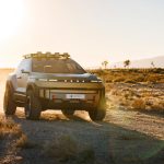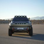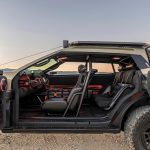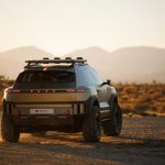 The body coloring is a “dune gold matte” finish (green-gold matte) inspired by California coastal and desert terrain, accented with anodized orange key touchpoints. The interior leans into a rugged but tech-savvy character: a roll-cage element, supportive seats with bolsters, four-point seatbelt hinting at off-road use, BYOD (“bring your own device”) digital flexibility, and full-width head-up display including rear-camera mirror feed.